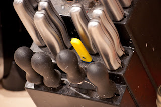 But it was too funny not to take a picture. I have no idea which of my children decided to put the plastic “play” knife in the real knife block….but at least they are putting things away….even if not in exactly the right place